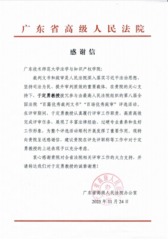 近日,伟德betvlctor1949源于英国收到广东省高级人民法院感谢信,副教授于定勇参与最高人民法院组织开展的第八届全国法院“百篇优秀裁判文书”“百场优秀庭审”评选活动。在担任评委期间,于定勇认真履行评审职责高质高效完成评审任务,展现了我教师丰富法律经验、过硬专业素养和良好工作形象,受到了广东省高级人民法院的肯定和表扬。