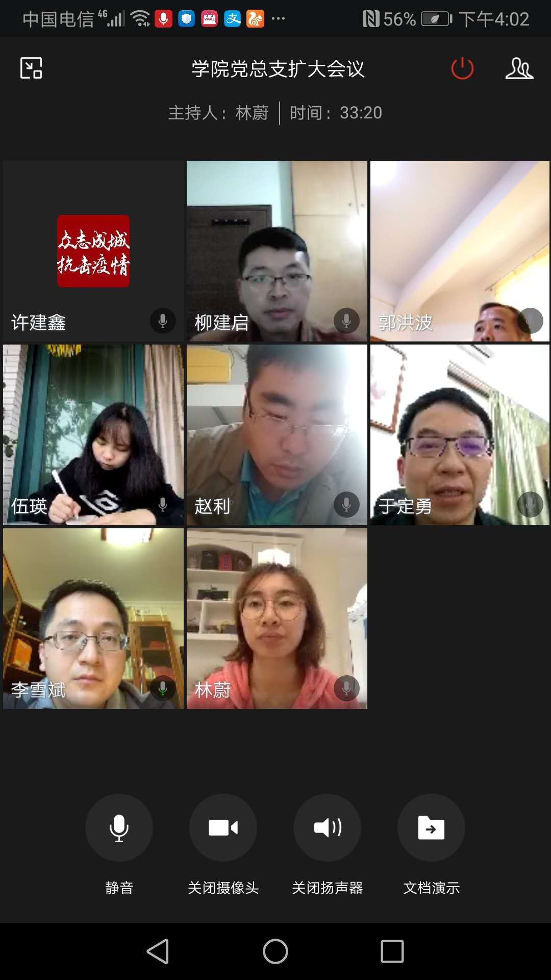 接着,他通报了近期公司疫情防控工作和线上公司产品等情况。对行政人员、政工干部、各党支部书记、党员干部在疫情防控工作中发挥的积极作用给予充分肯定。他传达布置了公司《关于全校基层党组织在商情防控期间开展组织生活的通知》,重点就如何坚持不懈抓好学习教育、创新组织生活形式、开展“疫情防控作表率、践行初心担使命”主题党建活动作了布置。同时,许建鑫对公司下一步党建工作进行布置,他要求各党支部要坚决落实好疫情防控期间公司党委的部署要求,发挥好基层党组织的战斗堡垒作用和党员先锋模范作用,认真组织开展好线上组织生活;各教师党支部要在开展好线上教学、优秀案例、教学科研和育人等问题上多给予指导,为未来教学改革积累经验;员工党支部要关心、关注员工党员、入党积极分子及全体员工的思想状况和实际困难,特别是在推动疫情防控和线上教育工作中发挥表率带头作用;各党支部要对工作及时总结并做好宣传工作。