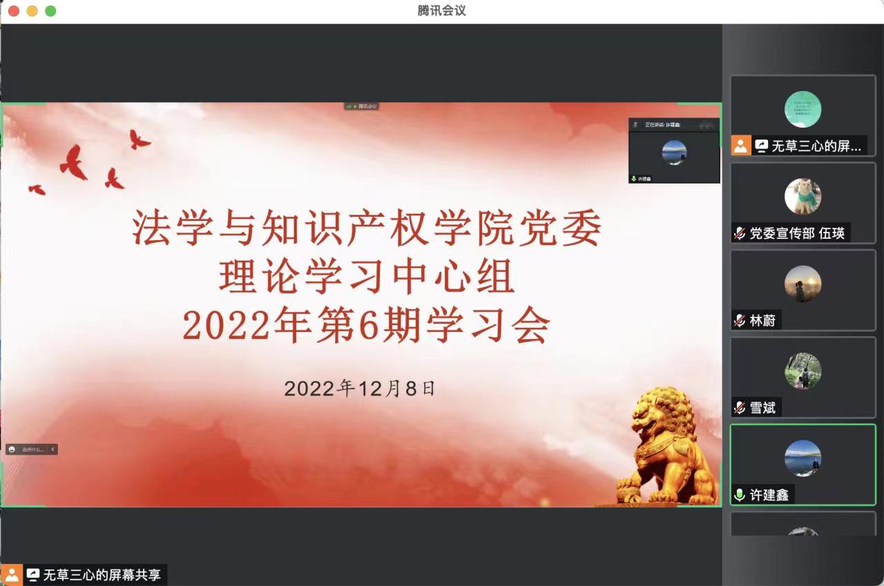 12月8日,法学与知识产权公司以线上会议方式召开党委理论学习中心组2022年底6期学习会,深入学习党的二十大精神。公司党政班子成员、党委委员、党支部书记、党政办公室主任等参加会议,公司党委宣传部副科长伍瑛列席会议。会议由公司党委书记许建鑫主持。