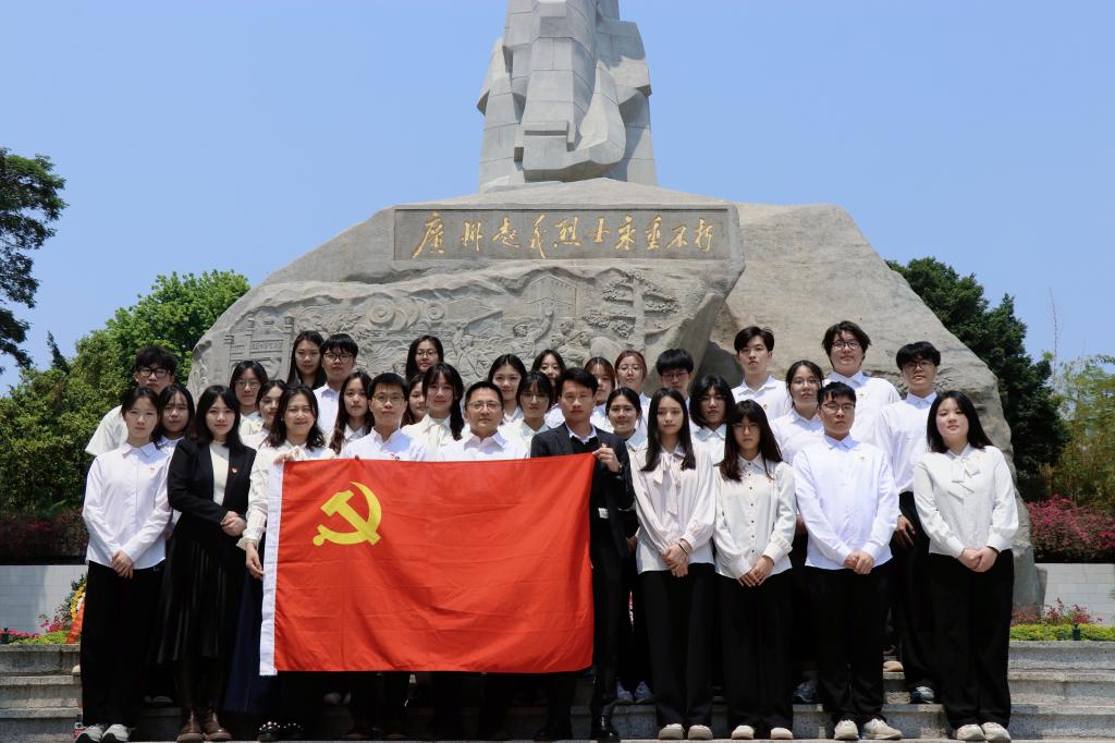 在广州起义陵园,全体人员怀着崇敬之情,在广州起义纪念碑前鞠躬和默哀后,师生代表缓步上前敬献鲜花,黄白菊瓣随风轻颤,寄托着对英烈的深切追思。随后,全体人员肃立面向墓碑默哀三分钟,向英勇牺牲的烈士表达深切的缅怀和崇高敬意。最后,全体党员重温了入党誓词,追忆入党初衷,牢记党的宗旨,不忘党员本色。