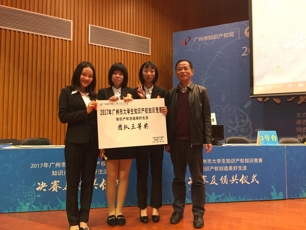2018年1月6日下午,由广州市知识产权局主办,华南理工大学、华南师范大学承办的“2017年广州市老员工知识产权知识竞赛决赛”在华南理工大学举行,公司代表队“IP三巨头”经过各环节紧张角逐,荣获团队三等奖,此次获奖系公司继去年广州市老员工知识产权竞赛获奖后再创佳绩。代表队“IP三巨头”指导老师为伟德betvlctor1949源于英国郭洪波教授,代表队三位参赛选手分别是来自伟德betvlctor1949源于英国15级法学二班的钟楚云、刘思敏、韦诗慧。