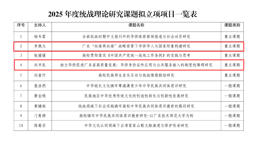 本年度获批的重点项目课题立足国家重大战略与区域发展需求,聚焦华侨华人与高质量发展的前沿问题,分别是李佩文主持的《广东“向南再向南”战略背景下华侨华人与国家形象构建研究》、刘书辰老师主持的《助力华侨促进广东省高质量发展:华侨身份证件应用与公共服务接入的制度性障碍研究》。
