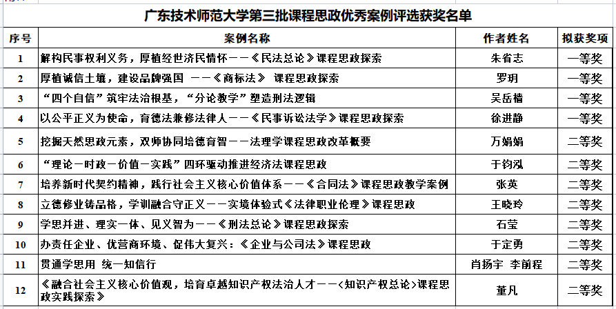 在获奖课程思政案例中,朱省志老师申报的《解构民事权利义务,厚植经世济民情怀——<民法总论>课程思政探索》、罗玥老师申报的《厚植诚信土壤,建设品牌强国 ——<商标法>课程思政探索》、吴岳樯老师申报的《“四个自信”筑牢法治根基,“分论教学”塑造刑法逻辑》、徐进静老师申报的《以公平正义为使命,育德法兼修法律人——<民事诉讼法学>课程思政探索》获得校级一等奖;万娟娟、于钧泓、张英、王晓玲、石莹、于定勇、肖扬宇、李前程和董凡老师的思政案例分别获得校级二等奖。