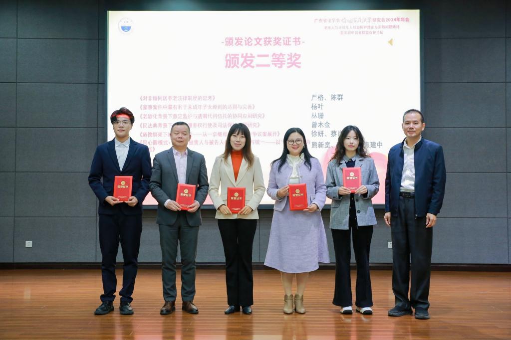 本次会议主题为“老年人与未成年人权益保障问题研究”,会议围绕“老年人保障专题”“未成年人权益保障专题”“一老一小共性研究专题”展开。公司教师代表朱腾伟副教授做了“广东省法学会婚姻家庭法学研究会2024年学术年会论文综述”的专题报告,公司法学专业本科生曾木金撰写的论文《民法典背景下老年人赡养权行使及司法保护问题研究——基于广东省314份赡养纠纷判决书为分析样本》获得年会优秀论文评比二等奖。在本次会议上,朱腾伟副教授当选为广东省法学会婚姻家庭法学研究会副会长,陈雪珍副教授当选为广东省法学会婚姻家庭法学研究会理事。