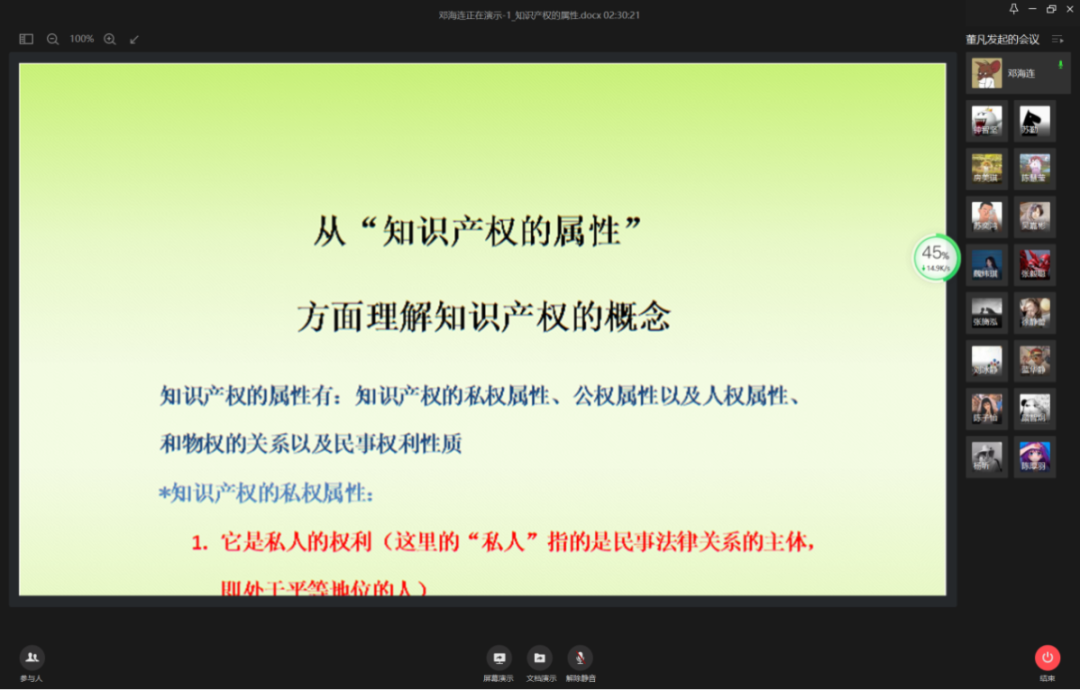 本次线上论坛总共分为三项议题,即“世界知识产权日”的发展沿革与确立意义、绿色健康语境下知识产权保护的多元理解、知识产权学科的特殊性与学习心得交流,共有22名同学在本次线上研讨会进行主旨发言和评议,现将会议信息简述如下: