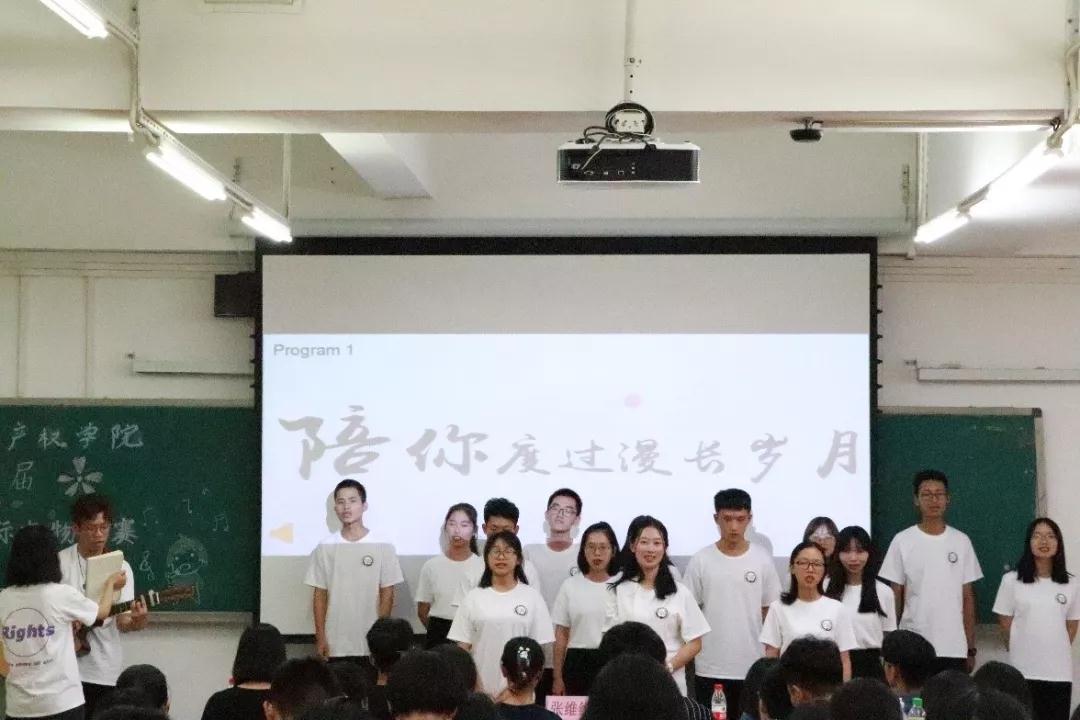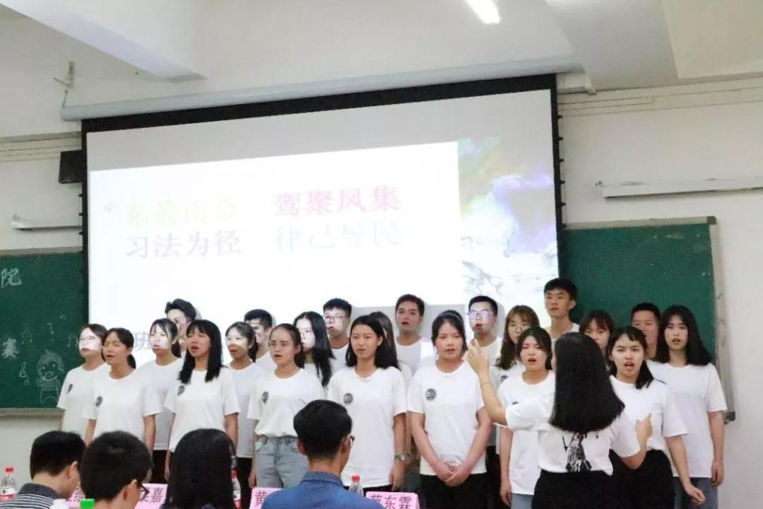 首先登场的是19法学四班。他们以一支短视频徐徐展现班级的美好回忆,紧接着四名帅气男生上场表演了一段武术,一拳打出英气无畏,一脚踢出潇洒果断,而后画风一转,合唱组同学一首《让我留在你身边》娓娓唱出他们对班级的热爱,对未来的期待!“东箭南金,鸾聚凤集。习法为径,律己导民。”大胆朝前走吧,展现法知人的风采!