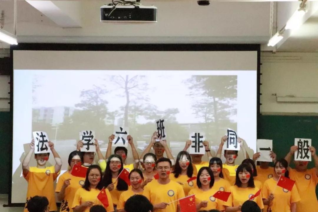 随后登场的是19法学六班。以幽默风趣的视频引起全场观众的兴趣,橙色的班服明亮而耀眼。一曲《我和我的祖国》的班级合唱,饱含着对祖国的无限热爱,手中挥舞着五星国旗,伴随激情澎湃的歌声,是作为法律人对祖国的承诺,也正呼应了六班班徽上对真理与公正的追求!