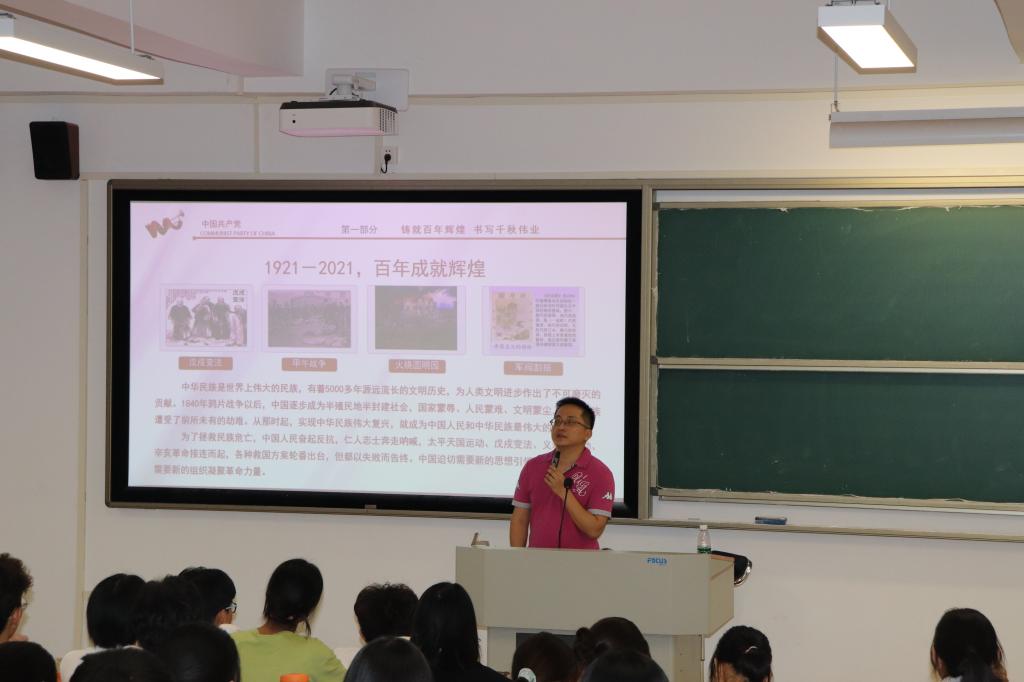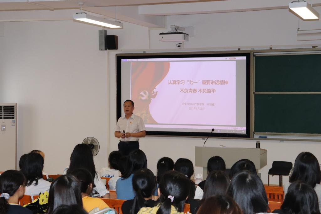 许建鑫以《“认真学习‘七一’重要讲话精神 不负青春 不负韶华》为主题展开授课,带领2021级法学3班、4班同学深入学习习近平总书记“七一”重要讲话精神。他回顾了中国共产党百年的光辉历程,引导同学们坚定不移听党话、感党恩、跟党走。他同时进行校史校情、疫情防控、学风和纪律安全教育,要求同学们坚定信念信仰,认真学习习近平新时代中国特色社会主义思想,自觉参加党史学习教育,尽快适应大学学习生活,认真思考、规划职业生涯,养成良好的学习、生活、锻炼习惯,从自身做起、从身边小事做起、从现在做起,努力做一名合格的社会主义建设者和接班人。
