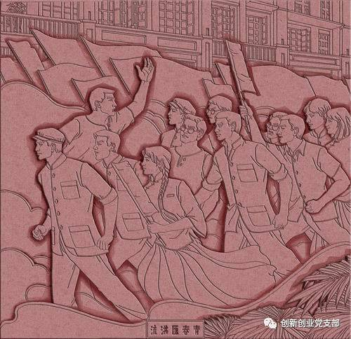 走近雕塑可发现,六幅画面以浮雕的形式镶嵌在主雕塑的基座上。基座正面,分别刻有团一大旧址介绍和“入团誓词”。 其余四面分别是主题为“青春汇洪流”、“群英聚东园”、“立纲铸伟业”、“先驱连工农”的浮雕。“青春汇洪流”反映了青年员工弘扬五四精神,走上街头声援北京员工爱国运动,开展声势浩大的传播新思想和救国救民行动。青年运动的蓬勃开展为建团奠定了思想基础和社会基础;“群英聚东园”反映了全国团员青年、工人代表1500多人在东园参加隆重举行的中国社会主义青年团第一次全国代表大会开幕式。张太雷在主席台慷慨激昂地致开幕辞;“立纲铸伟业”反映了“团一大”会议代表群策群力研定纲领,制定章程,明确团的领导核心。这次大会宣告中国社会主义青年团正式成立,成为中国青年运动发展史上的一个里程碑;“先驱连工农”反映了团员青年深入到工人、农民当中派发《先驱》报,宣传马克思主义真理,传播革命思想。