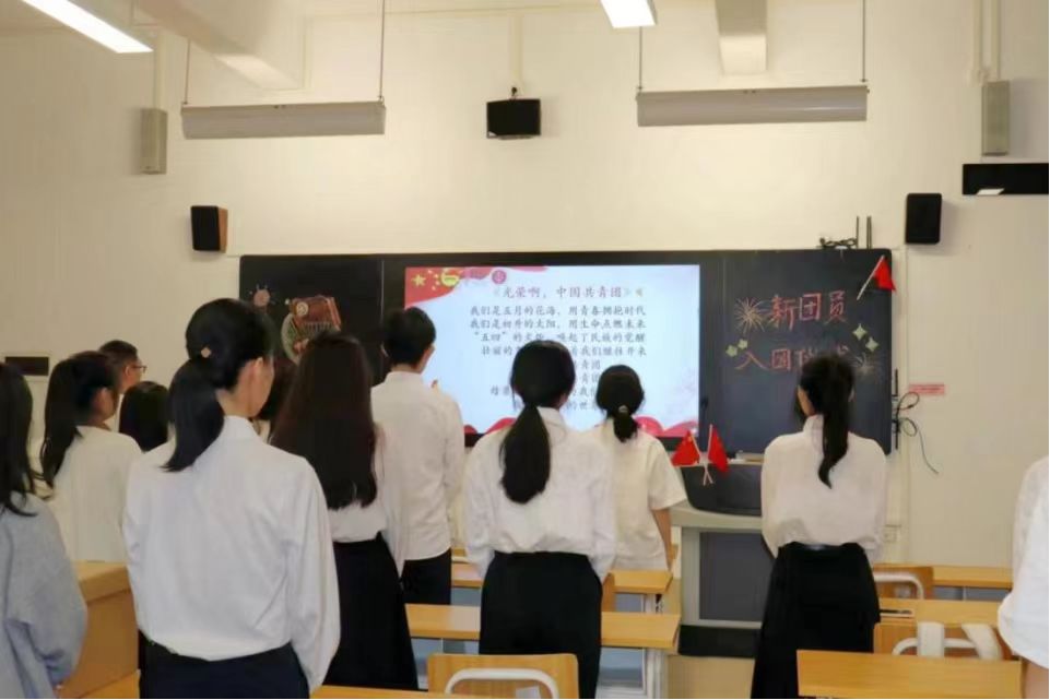此环节现场全体同学共同奏唱团歌:《光荣啊,中国共青团》。响亮的歌声回荡在教室里,让大家深刻熟悉到自己是一名共青团员,我们是初升的太阳,用生命点燃未来,我们有责任为共青团的美妙明天谱写更加壮丽的青春之歌!