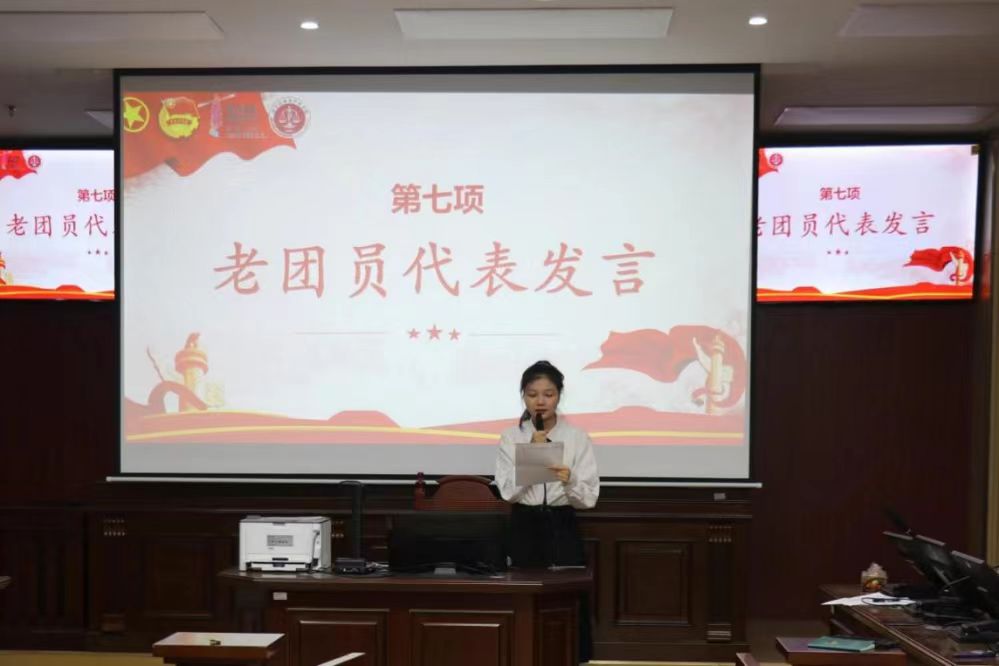 老团员代表张嘉薇、曹婧蕾发言。首先,她们代表老团员们向新团员表示热烈的祝贺,欢迎他们加入共青团大家庭。同时她们希望新团员们今后在思想上不断鞭策自我,提高思想觉悟;在行动上积极为团奉献,充分发挥自身优势,牢记入团初心,努力做有理想、有本领、有担当的社会主义建设者和接班人!