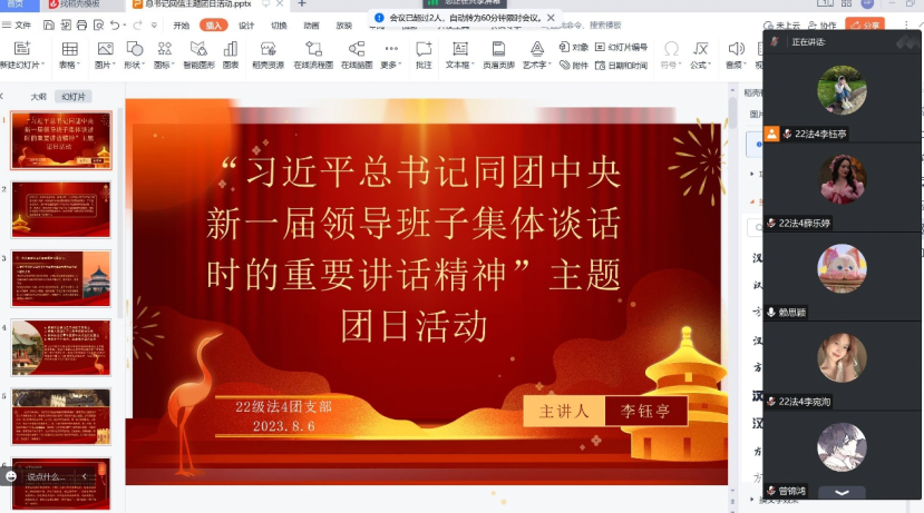 同学:“全体团员一同观看了《关于习近平总书记同团中央新一届领导班子集体谈话精神》视频,回顾了习近平总书记在谈话中强调的重点内容,深刻认识到党和国家事业的希望寄托在青年身上。作为新时代中国共产主义青年的我们,要牢记习近平总书记的殷殷嘱托,不负期望,坚定中国特色社会主义共同理想,坚定不移听党话、跟党走的政治信念,激发强国有我的青春激情,努力成长为有理想、敢担当、能吃苦、肯奋斗的新时代好青年,积极投身中国式现代化建设。”