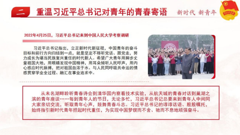 同学:“通过本次主题团日活动的学习,深刻体会到以习近平同志为核心的党中央对青年一代无限关怀、对青年工作高度重视,我备受鼓舞,将努力学习贯彻党的二十大精神,牢记习近平总书记的嘱托,在党的领导下,以理想者、担当者、吃苦者、奋斗者的姿态,奋进新征程,诠释新青春,创造新成绩!