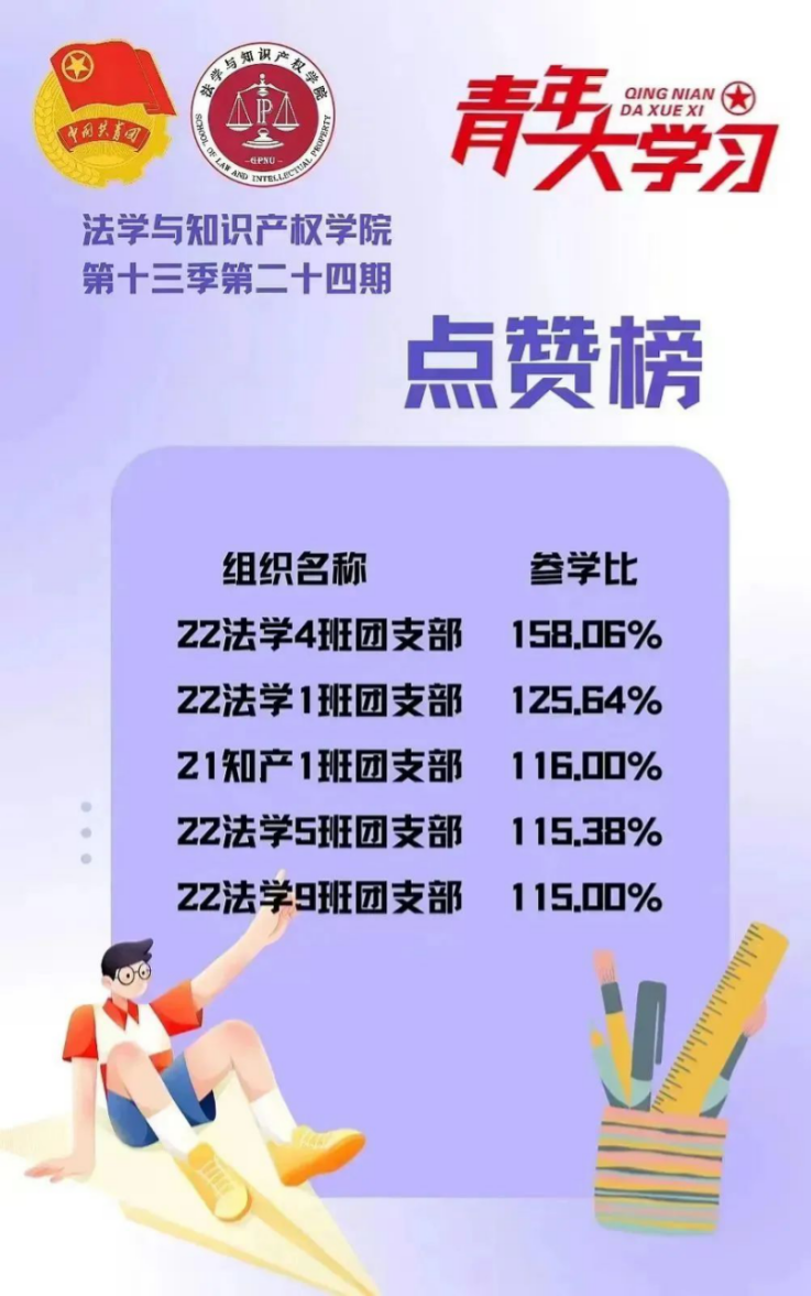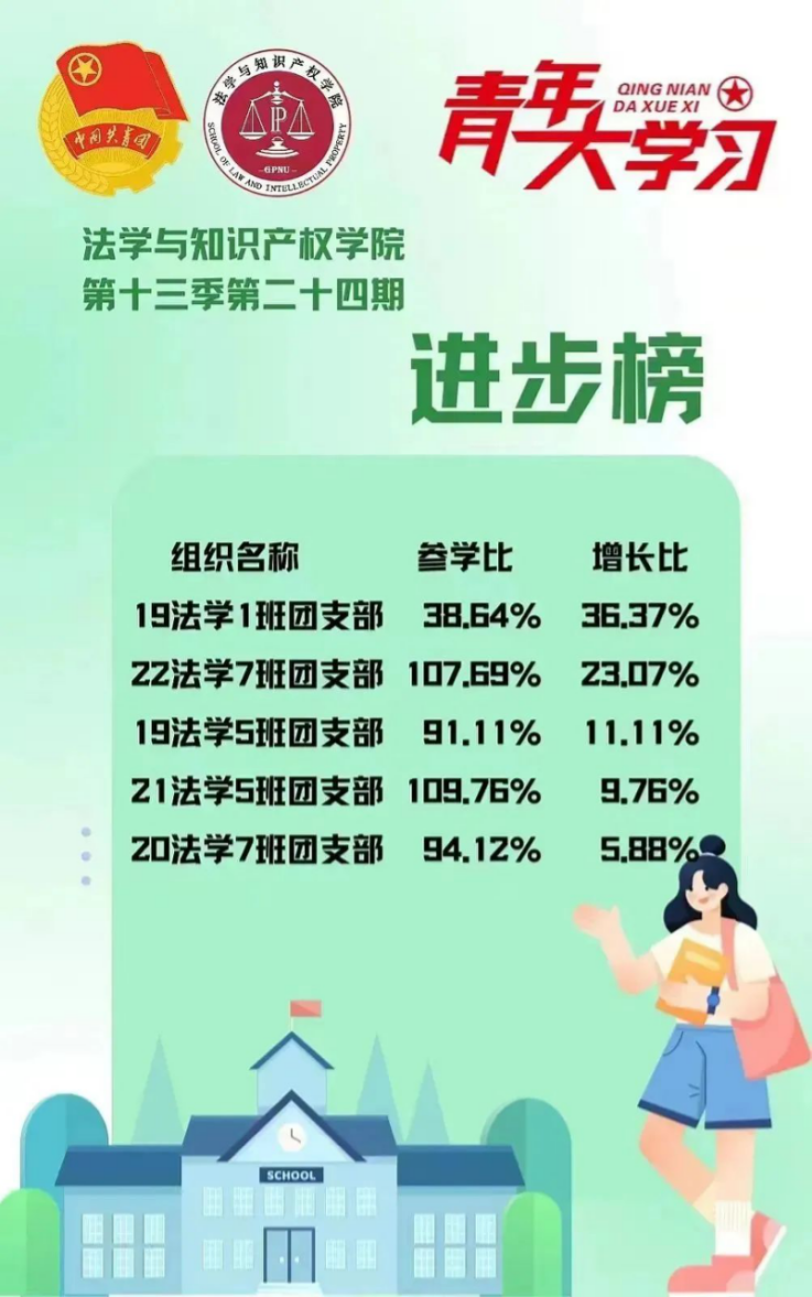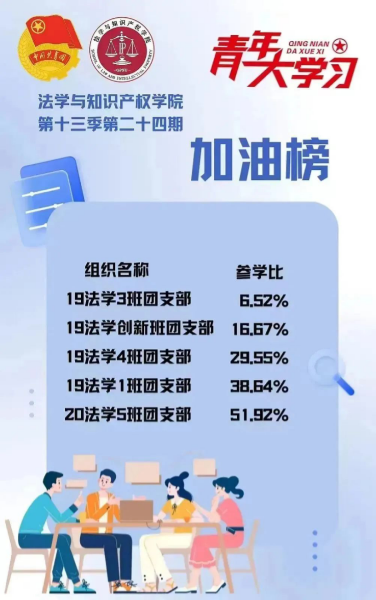 从各基层组织的课程学习情况来看,公司22法学4班、5班、9班团支部,21法学1班、知识产权1班团支部的参学成绩优异,是各支部学习的优秀榜样!此外,22法学7班、21法学5班、20法学7班、19法学1班、19法学5班团支部的参学积极性也有所提高,值得表扬。