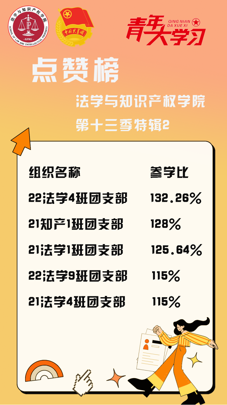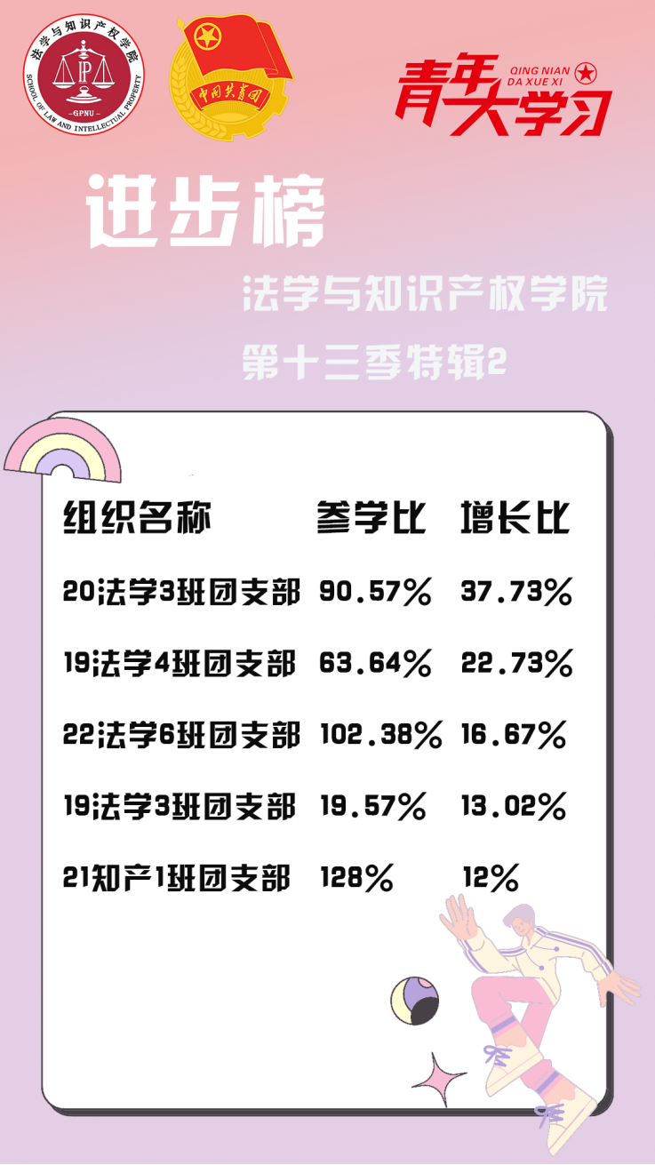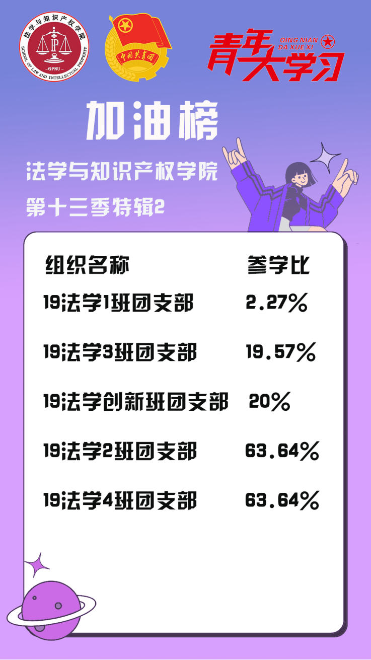 从各基层组织的课程学习情况来看,公司21级法学1班、4班、知产1班团支部、22级法学4班、9班团支部的参学比均达到110%以上,值得表扬!此外,19级法学4班、3班团支部、22级法学6班团支部、20级法学3班和21级知产1班团支部的参学增长比均达到了10%以上,参学的情绪高涨!最后希望参学比不足50%的班级团支部向优秀的班级团支部看齐,提高学习的热情。