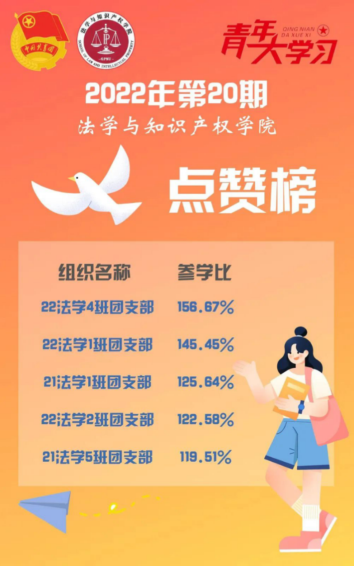 从各基层组织本周的课程学习情况来看,公司22级法学1班、2班、4班团支部,21级法学1班、5班团支部的参学情况优异,是各团支部优秀的学习榜样!
