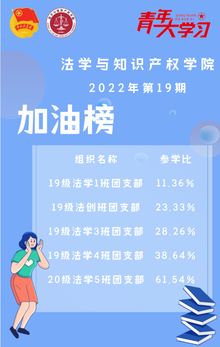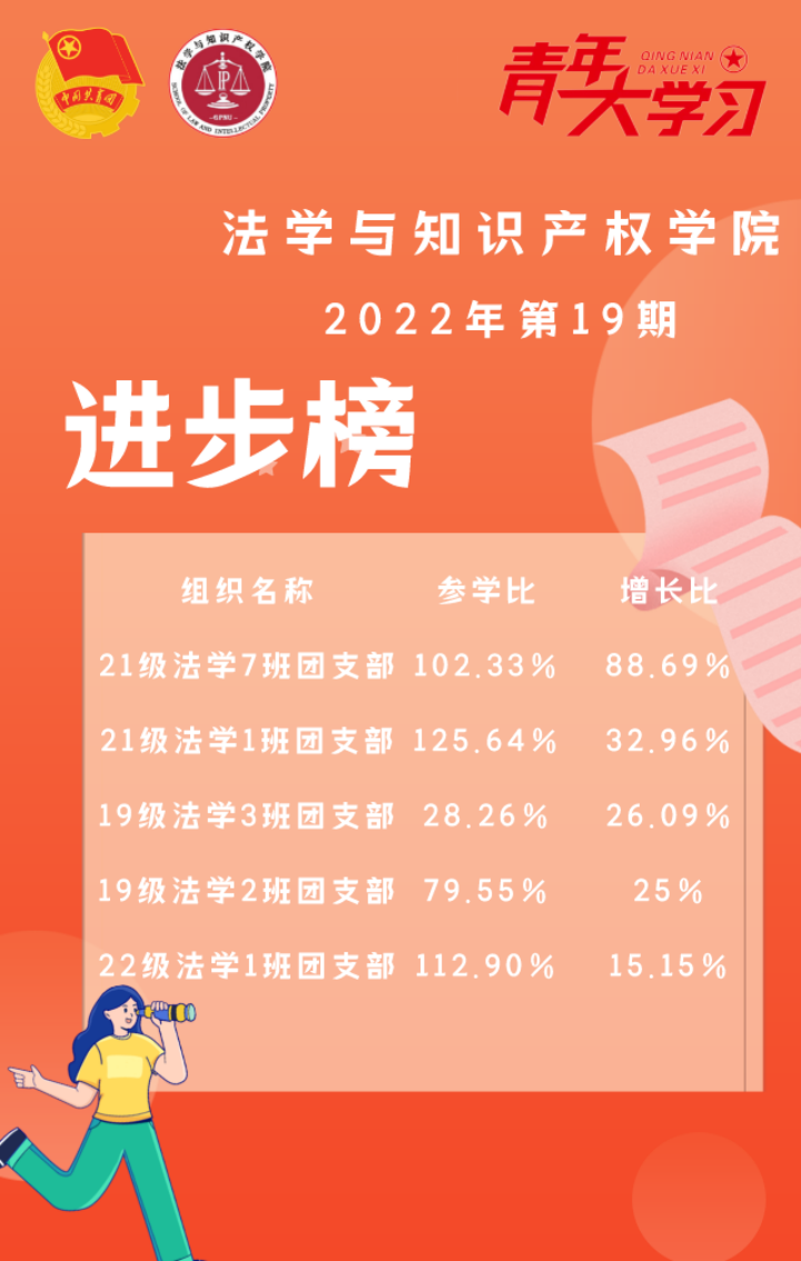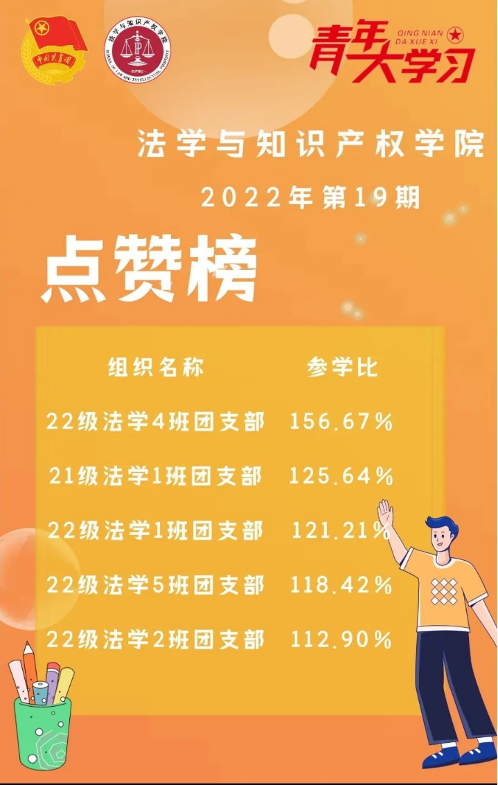 从各基层组织的课程学习情况来看,公司22级法学4班、21级法学1班、22级法学1班、22级法学5班以及22级法学2班团支部的参学情况优异,是各团支部优秀的学习榜样!