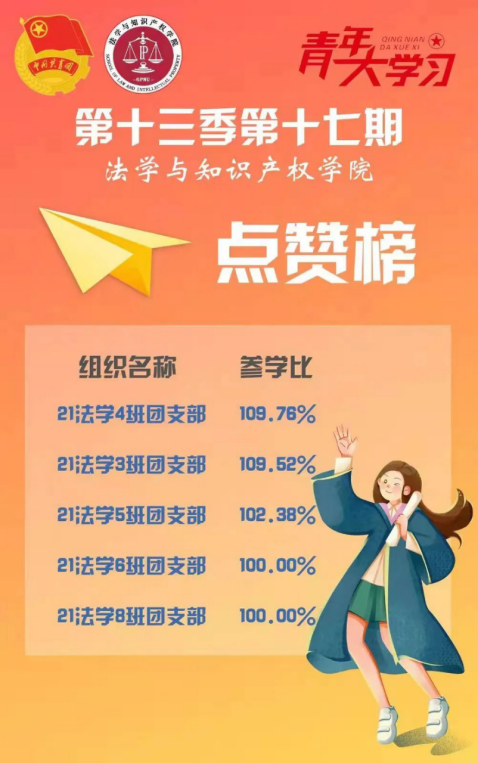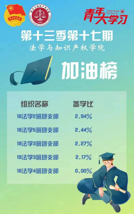 同时19法学1班团支部、19法学创新班团支部、21法学8班团支部、20法学7班团支部和19法学6班团支部的参学积极性也有所提高。