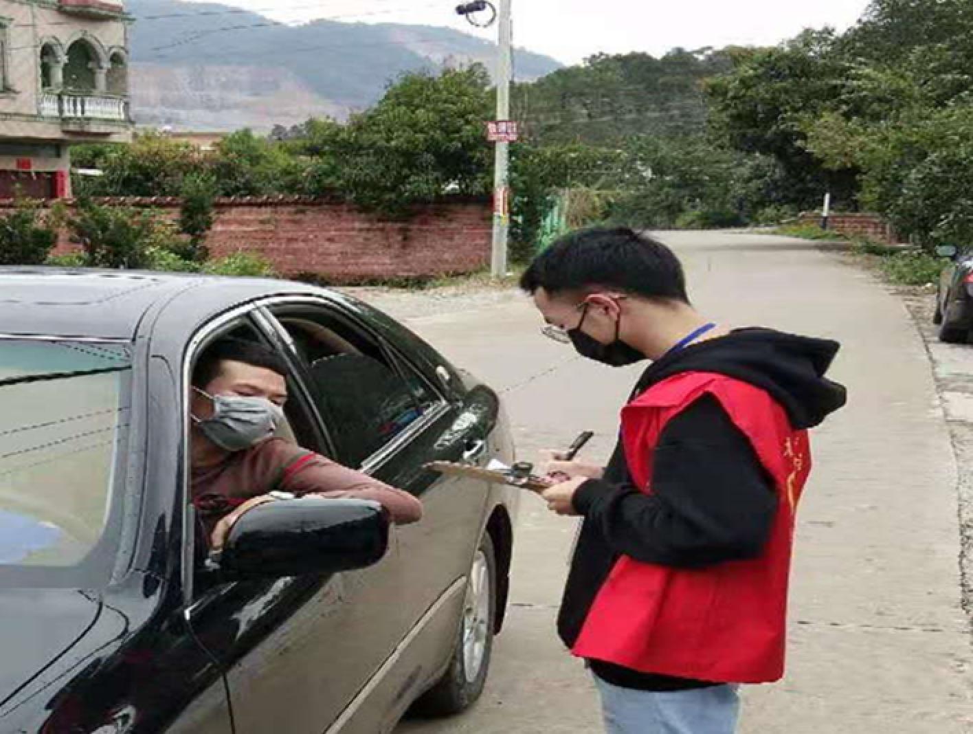 18法学2班的盘丽梅同学,在广东省清远市南岗村防疫临时卡点登记外来外出人员、量体温、宣传病毒的严重性与其注意事项。