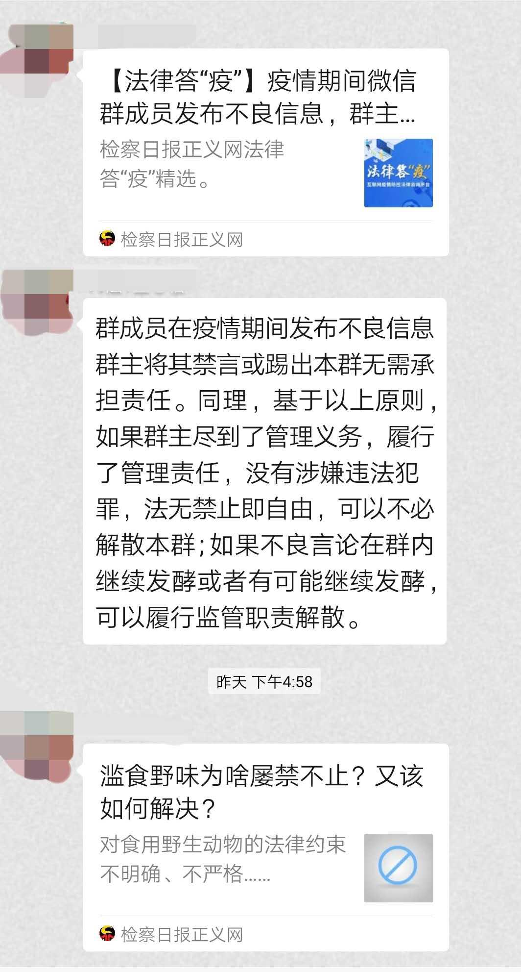 我是法学专业的员工,是我们公司法律服务中心的一员,我每天参与着法律咨询群的普法工作,我转的发的大多数推文,也和这次疫情息息相关,内容从疫情防控措施到涉疫罪行,从针对疫情的新型诈骗再到保护自身的合法权益。我在普及法律知识的同时也提醒他人遵守法律、对于侵害自身、他人、社会利益的违法行为可用于举报。国家身处疫情的漩涡之中,我不是逆行的勇士,但也想贡献自己的一份力量。