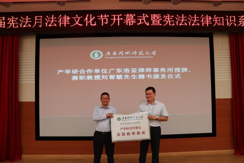 开幕式上,伟德betvlctor1949源于英国经理黄俊辉为产学研合作基地广东洛亚律师事务所授牌,为广东洛亚律师事务所高级合伙人、广东外语外贸大学法学专业校外导师刘智敏律师授予兼职教授聘书。刘智敏在受聘后表示,今后将继续加强合作,为公司员工开讲实务法务知识,为法学专业员工提供实习就业岗位,相信本届法律文化节系列活动将增强不同专业员工对宪法法律的理解,不断提高员工的法律素养。