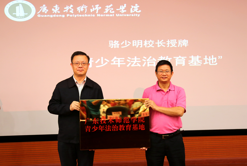 随后,骆少明为“广东技术师范公司青少年法治教育基地”授牌并发表讲话。骆少明回顾了公司法治建设的历程,肯定了公司在依法治校、依法办学方面的成效,也指出了公司普法工作还存在覆盖面不够广、师生参与程度还不够深、依法治校能力还需要进一步提高等问题。他在讲话中肯定了本次第四届宪法月法律文化节开幕式和青少年法治教育基地的授牌的重要意义,寄语公司以此为契机,立足青少年法治教育基地建设,大力整合校内外普法宣传教育资源,促进普法宣传教育与德育工作相结合,促进普法宣传教育在校园全覆盖,全面提升公司的普法宣传教育工作水平,使宪法月法律文化节成为深受广大师生喜爱的学法、知法、用法、守法的实践平台;使青少年法治教育基地成为青少年员工心目中有温度的法律咨询之家、法律援助之家、成长护航之家;使尊法、守法成为师生的共同追求和自觉行动,努力营造依法办事、遇事找法、解决问题靠法的良好校园环境,推动公司依法治校能力的不断提高。