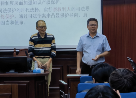 4月29日,在“第二届知识产权月”之际,公司邀请广州知识产权法院三级高级法官蒋华胜,在白云校区三训模拟法庭作“知识产权损害赔偿司法保护的若干问题”主题讲座。公司经理黄俊辉,副经理李小萍,知识产权系主任林蔚,教授王渊,教师董凡、李想,21、22级知识产权班和法学班部分同学共80人左右参加讲座。讲座由黄俊辉主持。