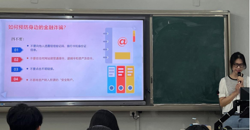 本次宣传活动分别在白云校区和河源校区同时举行,辅导员王嘉晨老师以经典案例等形式为同学们开展防诈宣传;助学助理在白云校区为大家详细介绍了本次宣讲的背景、金融诈骗的惯用手段以及向同学们普及预防金融诈骗方法,即“四要”——转账前要通过电话、视频等方式核对对方身份,微信支付宝要开启转账延迟到账功能、发现被骗可以及时撤回,网上聊天要留意系统弹出的防诈骗提醒,接到可疑电话或发现自己亲友被骗的要及时拨打110;“四不要”——不要向他人透露短信验证码、银行卡和身份证信息,不要在任何网站接受通缉令、逮捕令和资产冻结令,不要点击不明链接,不要将资产转入所谓的“安全账户”。
