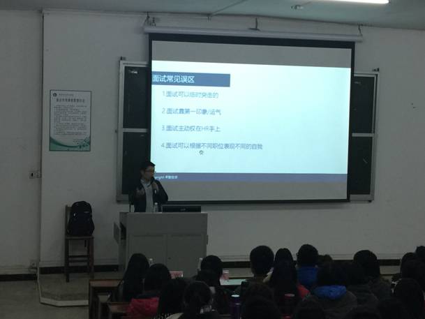 12月18日晚上,广东人力资源研究会会员、一汽大众汽车有限公司佛山分公司人力资源管理部门黎金荣经理应邀来公司作主题为《面试方法与技巧介绍》的就业讲座。讲座在北校区阶梯教室进行,现场座无虚席。政法公司张艳清老师、辅导员赵利老师和同学们一起认真地聆听了讲座。