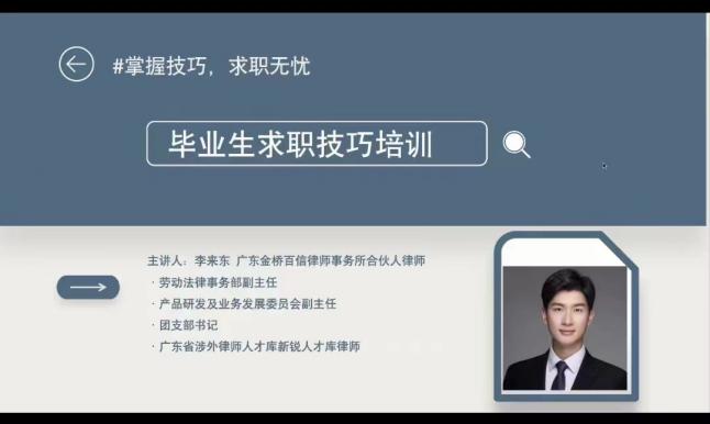 为帮助毕业生解决求职过程中遇到的困难和问题,促进毕业生更充分就业。公司于4月22日举办“识面试之巧 ‘职’冲云霄”求职面试技巧经验分享会,邀请了广东金桥百信律师事务所李来东员工线上分享,2024届毕业生积极报名参会。