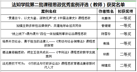 在公司第二批“课程思政”优秀案例评选中,公司被评为“课程思政建设先进单位”。其中,获得一等奖思政案例4个,获得二等奖思政案例2个,分别为:朱腾伟老师申报的《“贯通古今、以史为鉴、润物无声”式<中国法律史>课程思政》、曾媛媛老师申报的《加强生物多样性法律保护,共建地球命运共同体》、陈雪珍老师申报的《“线上线下+课内课外”四位一体加强刑事诉讼法课程思政》、焦娟老师申报的《培养关切社会、勇于担当的法律人——<劳动与社会保障法>课程思政探索》获得校级一等奖,林蔚老师申报的《德法兼修融思政,师生互促共成长——<专利法>课程思政教学实践案例》、柳建启老师申报的《法无授权不可为:<行政法与行政诉讼法>课程思政育德法兼修新时代人才》获得校级二等奖。