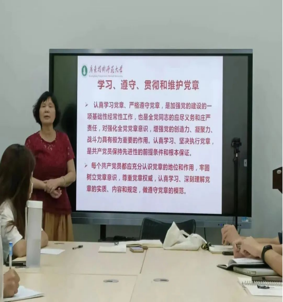 最后,胡晨波老师总结道:“坚决执行党章是共产党员保持先进性的前提条件和根本证明,每个共产党员都应当充分认识党章的地位和作用,牢固树立党章意识,尊重党章的权威,认真学习深刻理解党章的实质内容和规律。”时代呼唤着我们,人民期待着我们,唯有矢志不渝,笃行不怠,才能不负人民,不负时代。我们要积极向优秀党员学习,团结在党中央的周围,坚定信心,同心同德,埋头苦干,奋勇前进,为实现中华民族伟大复兴团结奋斗!