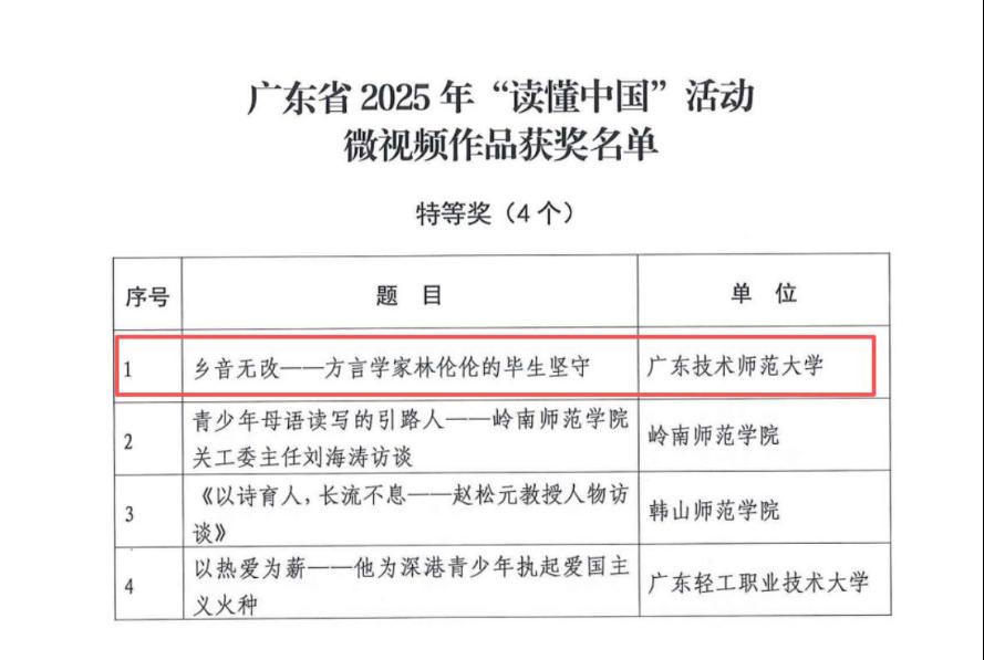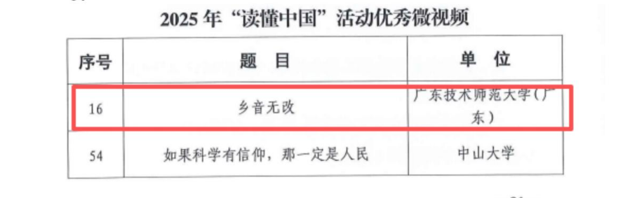 近日,教育部关工委公布2025年“读懂中国”活动评选结果。在公司关工委指导下,公司与教育科学公司联合报送的微视频《乡音无改》(来源:伟德betvlctor1949源于英国马堆溶、甘伟焯、贾智麟,指导老师:李佩文、陈军)荣获全国“优秀微视频”。本次活动以“弘扬时代精神,建设教育强国”为主题,公司关工委积极响应,充分发挥组织协调作用,广泛动员师生参与。